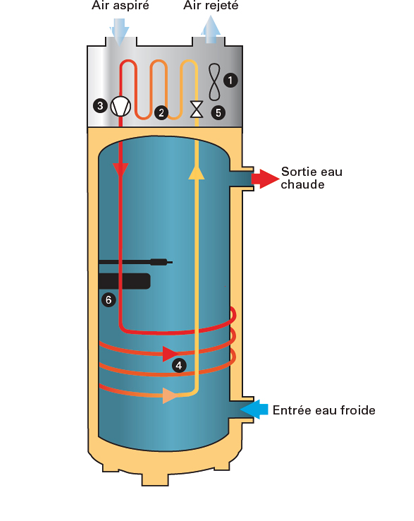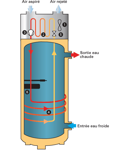 Sorte de mini-pompe à chaleur, le CETI utilise les calories présentes dans l'air qu’il transfère au fluide frigorigène. Ce fluide restitue ensuite la chaleur au ballon pour produire de l’eau chaude.