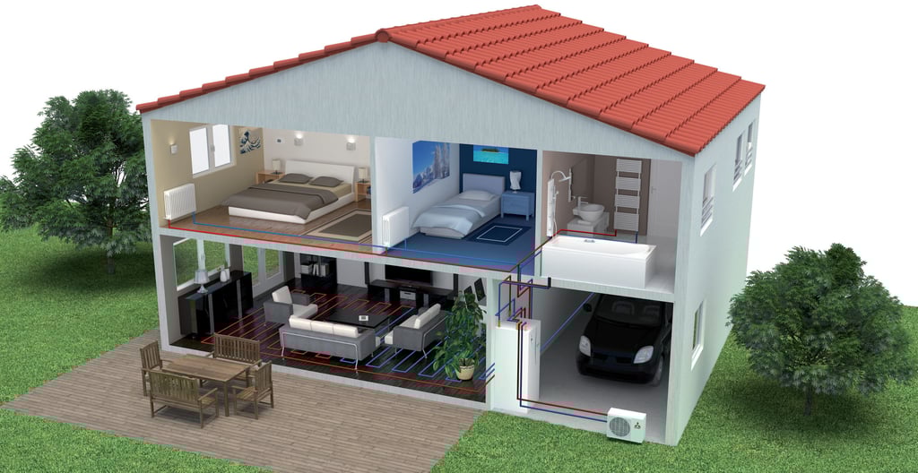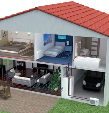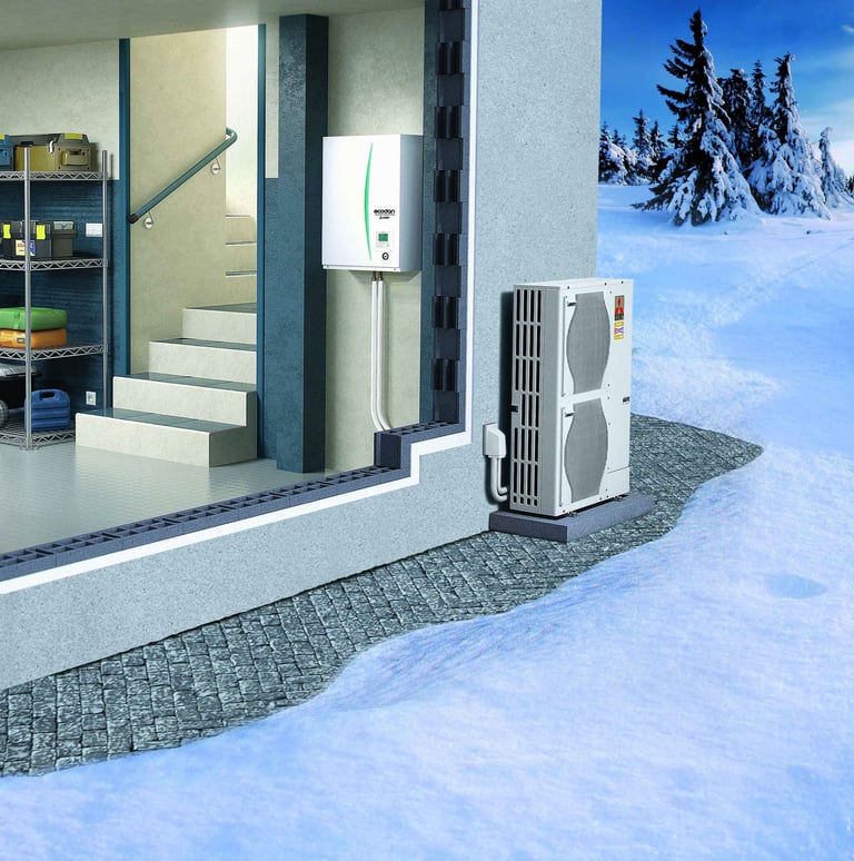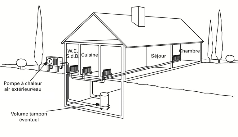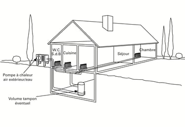 Dans ce cas, le fluide frigorigène reste dans l'unité extérieure et une liaison hydraulique (contenant de l'eau) relie la machine au réseau de la maison.